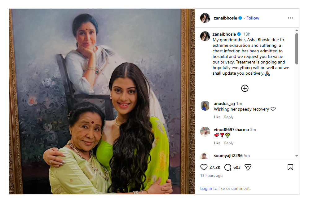 आशा भोसले की पोती जनाई भोसले ने सोशल मीडिया प्लेटफॉर्म इंस्टाग्राम के जरिए उनकी सेहत को लेकर अपडेट साझा किया। उन्होंने लिखा कि उनकी दादी को काफी थकान और छाती में इन्फेक्शन की शिकायत है, फिलहाल उनका इलाज चल रहा है और डॉक्टरों की निगरानी में उनकी हालत स्थिर है। परिवार को उम्मीद है कि वे जल्द ही स्वस्थ होकर घर लौटेंगी।