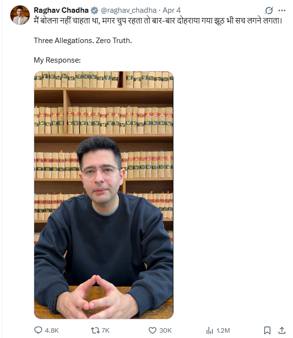 इन आरोपों पर पलटवार करते हुए राघव चड्ढा ने 4 अप्रैल को एक वीडियो जारी किया। उन्होंने कहा कि उनके खिलाफ “स्क्रिप्टेड कैंपेन” चलाया जा रहा है।
