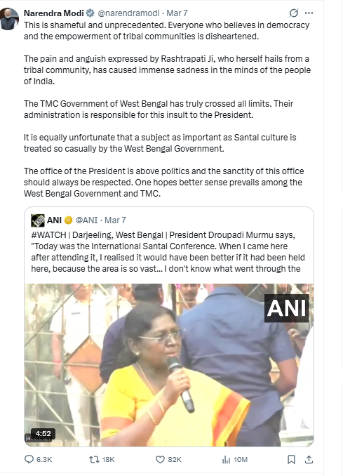 मोदी ने राज्य की तृणमूल कांग्रेस सरकार पर निशाना साधते हुए कहा कि प्रशासन ने इस मामले में सारी सीमाएं पार कर दी हैं और यह संविधान के सर्वोच्च पद का अपमान है।