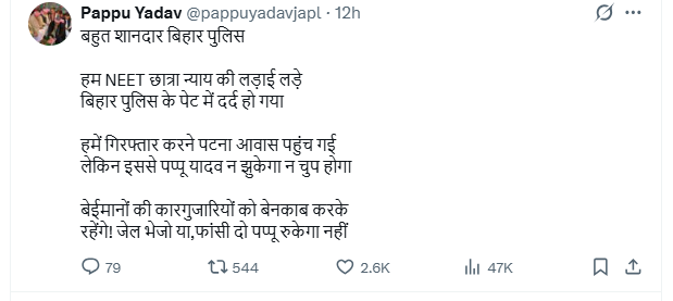 “शाबाश बिहार पुलिस। मैं NEET छात्रा को न्याय दिलाने की लड़ाई लड़ रहा था, इसलिए पेट में दर्द हुआ और आधी रात को मुझे गिरफ्तार करने आ गए। पप्पू यादव न झुकेगा, न चुप रहेगा। जेल भेज दो या फांसी दे दो, सच्चाई उजागर करता रहूंगा।”