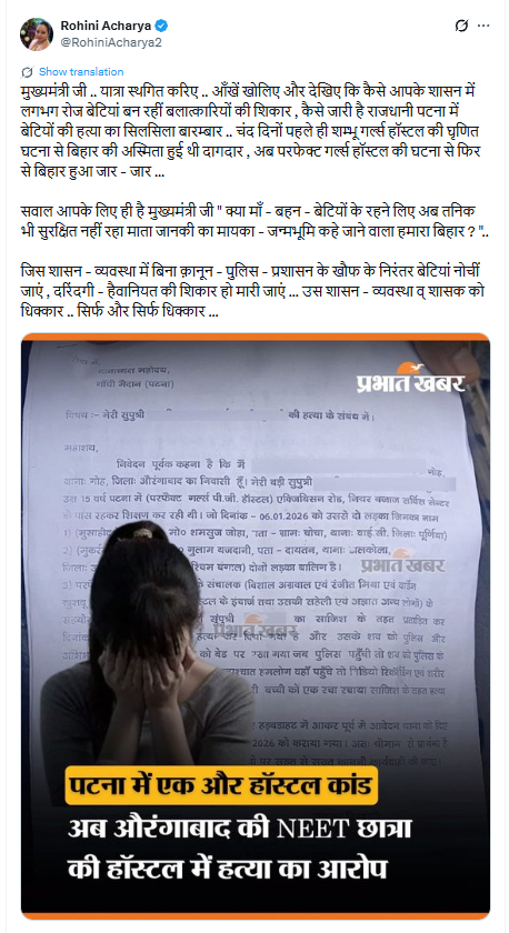 रोहिणी आचार्य ने आरोप लगाया कि पटना के हॉस्टलों में दरिंदगी और हैवानियत की घटनाएं बार-बार हो रही हैं, लेकिन अपराधियों में पुलिस और प्रशासन का कोई खौफ नजर नहीं आता। विपक्षी दलों का कहना है कि सरकार केवल जांच कमेटी और एसआईटी बनाकर अपनी जिम्मेदारी से नहीं बच सकती।