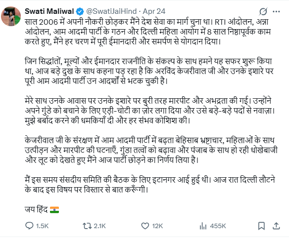 मालीवाल ने केजरीवाल को “महिला विरोधी, भ्रष्ट और गुंडागर्दी करने वाला नेता” तक कह दिया।