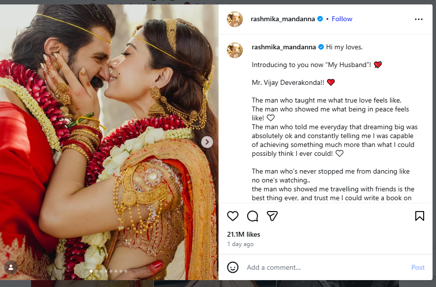 इस वील की सबसे खास बात थी इसके हेमलाइन के पास हाथ से कढ़े गए शब्द – “In Every Lifetime” (हर जन्म में)। यह वाक्य न सिर्फ एक रोमांटिक वादा था, बल्कि रश्मिका और विजय के रिश्ते की गहराई को भी दर्शाता था। इस एक लाइन ने पूरे ब्राइडल लुक को भावनाओं से भर दिया।