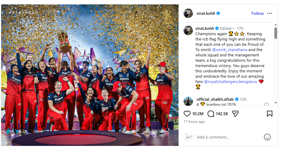 RCB की इस ऐतिहासिक जीत पर टीम के सबसे बड़े प्रतीक विराट कोहली खुद को रोक नहीं पाए। जीत के तुरंत बाद उन्होंने सोशल मीडिया पर लिखा—